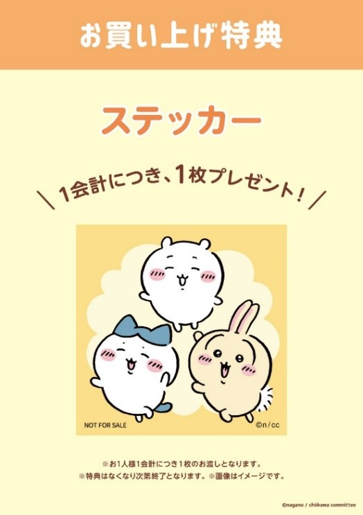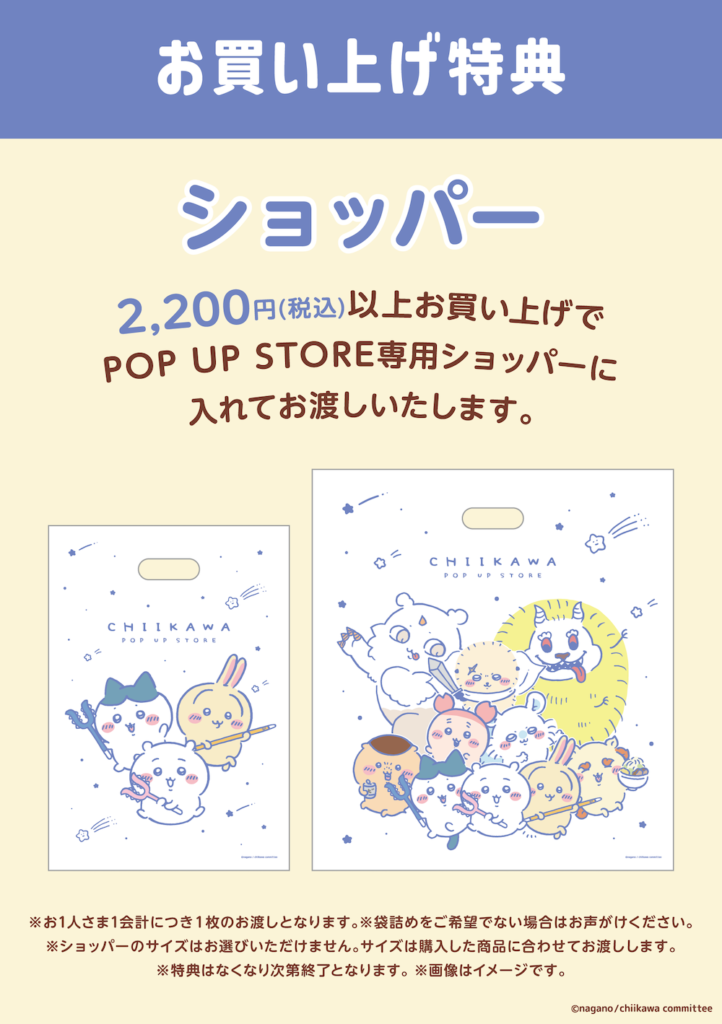 1회 구매 시 ‘스티커’ 1장을 증정합니다. 또한, 1회 2,200엔(세금 포함) 이상 구매 시 ‘팝업스토어 전용 쇼핑백’ 1개를 증정합니다. 쇼핑백 크기는 상품에 따라 달라지며, 선택할 수 없습니다. 1인당 1회 거래에 한해 1개를 받을 수 있으며, 수량 한정으로 소진 시 종료됩니다.