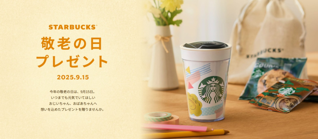 2025년 일본의 경로의 날은 9월 15일입니다. 일본 스타벅스도 마음을 담아 선물을 준비하는 분들을 위해 실용적이면서도 마음을 표현할 수 있는 선물을 준비하여, 어르신들의 건강과 행복을 기원합니다!
