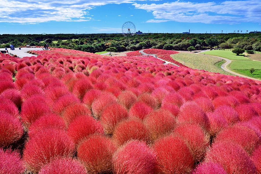 일반적인 단풍 명소와 달리 「국영 히타치 해변 공원(国営ひたち海浜公園)」은 상당히 이색적인 ‘단풍’ 신흥 명소입니다. 가을에 공원 내 미하라시 언덕(みはらしの丘)에 오면 언덕 전체에 만개한 코키아(빗자루풀)를 볼 수 있습니다. 코키아가 가을에 선명한 붉은색으로 변하여 많은 사람들이 인증 사진을 찍으러 찾아오면서 인기 관광지로 급부상했습니다. 이 코키아는 계절별로 색이 바뀌어, 10월 하순에서 11월에는 황금색으로 변한 코키아를 볼 수 있습니다.