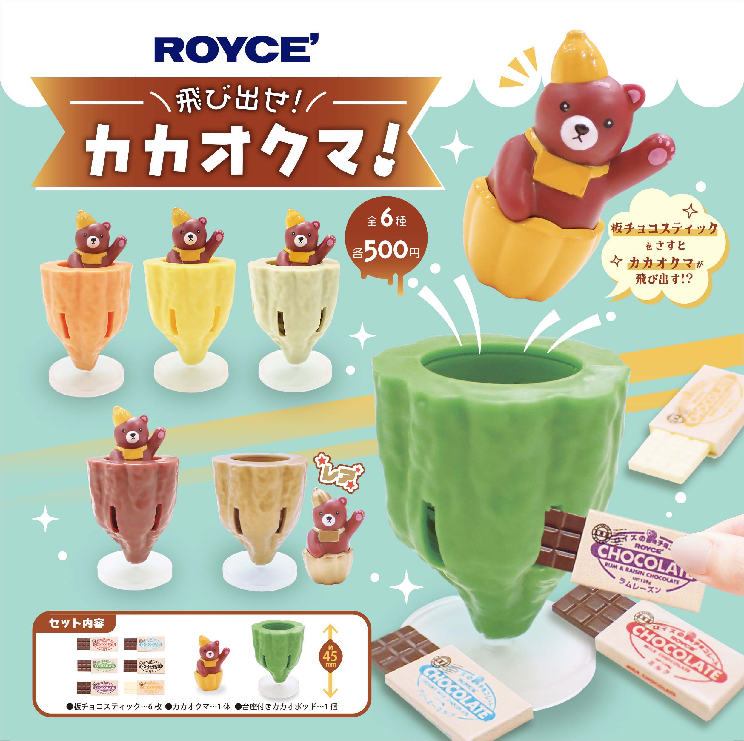 현재 출시된 굿즈 중에는 매장 내 캡슐토이 기계에 있는 이 시리즈의 가챠폰 장난감이 있는데요, 성질이 어릴 때 유행했던 장난감 ‘위기일발 해적통’과 좀 비슷해요. 초콜릿을 카카오 열매 안에 꽂다가 운 좋게 안쪽 장치를 건드리면, 카카오곰이 위에서 튀어나온답니다.