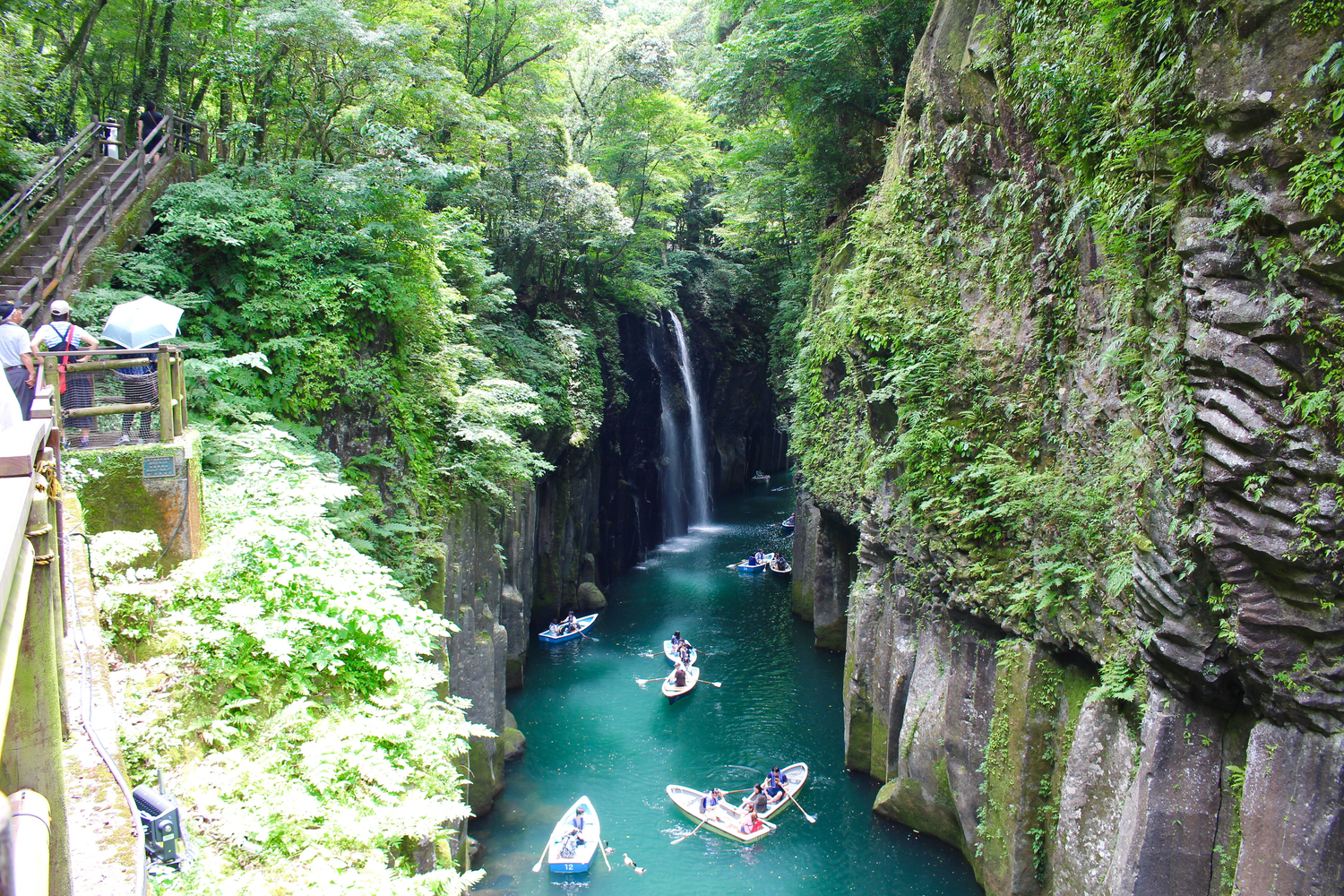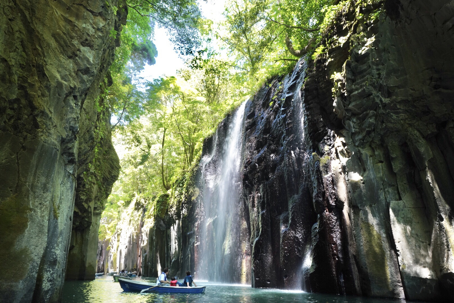 타카치호 협곡 내에서 가장 유명한 것은 마나이 폭포입니다. 거의 100미터 높이의 절벽에서 떨어지는 폭포는 ‘일본 폭포 100선’에도 선정되었습니다. 매년 5월, 타카치호 협곡은 초여름을 상징하는 신록으로 물들며 떨어지는 폭포와 어우러진 장관을 이룹니다. 작은 배를 타고 협곡 안으로 들어가거나 전망대에서 웅장한 경치를 감상하는 것 모두 최고의 선택입니다!