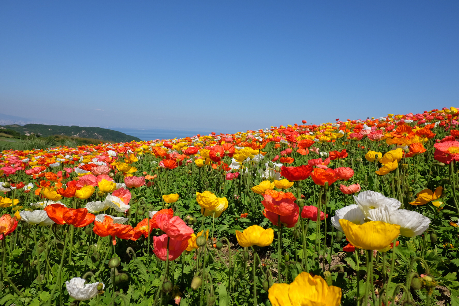 아와지섬은 효고현 남쪽에 위치한 섬으로, 1998년 아카시 대교 개통을 기념하기 위해 ‘아와지 하나사지키’가 설립되었으며 긴키 지역을 대표하는 꽃 공원입니다. 완만하게 이어진 언덕 위에 사계절의 꽃들이 피어나며 아카시 해협과 오사카만과 어우러져 장대한 아름다운 풍경을 만들어냅니다.