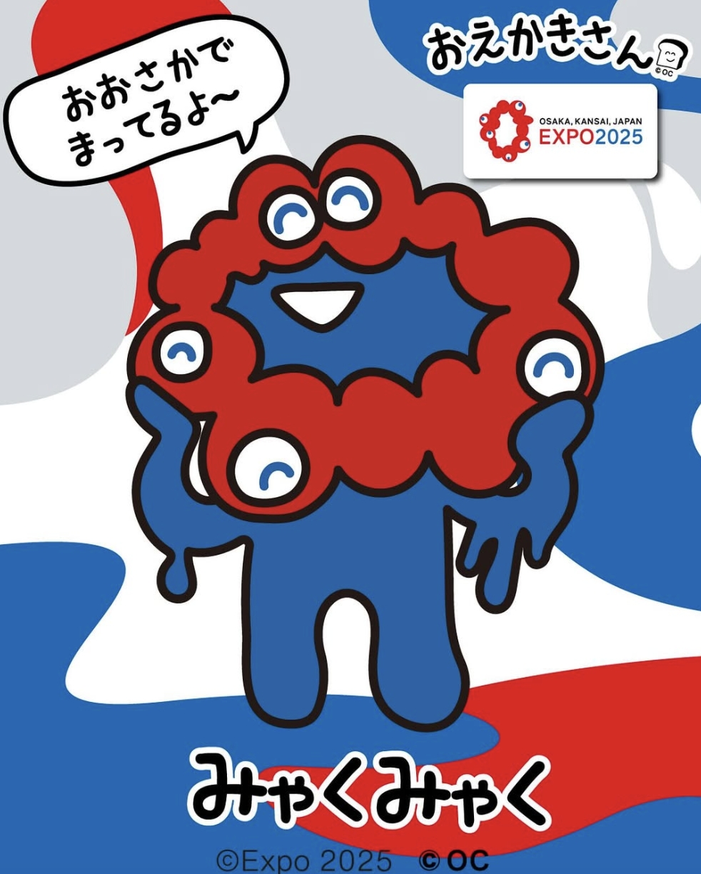 작년(2025년)에는 おえかきさん(오에카키상)이 오사카 엑스포 공식 마스코트 ‘묘쿠묘쿠(ミャクミャク)’와의 콜라보 상품도 출시했습니다. おえかきさん(오에카키상) 화풍이 적용된 묘쿠묘쿠는 파란 눈이 모두 웃을 때의 초승달 모양으로 변해, おえかきさん(오에카키상) 특유의 분위기를 느낄 수 있어요!