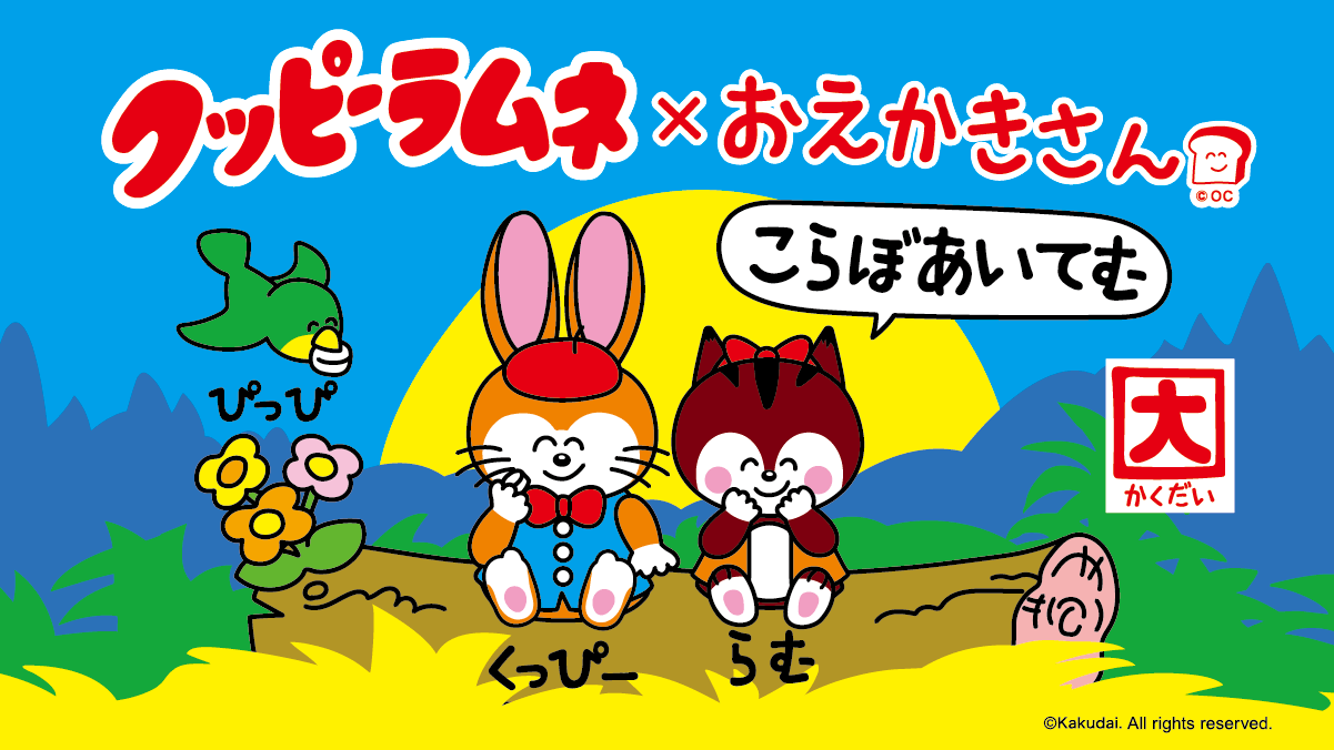 놀랍게도 사이다 캔디의 마스코트 ‘KUPPY RAMUNE’와도 콜라보를 진행했습니다. 원래 쇼와 시대 스타일의 두 동물 캐릭터(토끼 큐피와 다람쥐 라무)가 순식간에 おえかきさん(오에카키상) 화풍으로 변신하고, 표정도 おえかきさん(오에카키상) 특유의 웃는 얼굴로 바뀐 모습을 볼 수 있어요.