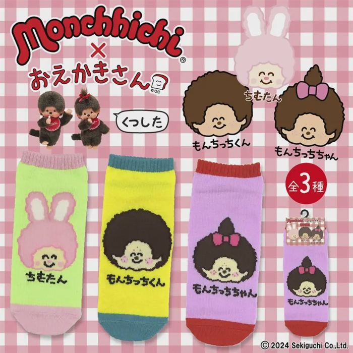 이 콜라보 시리즈는 3종의 양말을 출시했는데요. おえかきさん(오에카키상) 버전의 남자아이 몬치치, 여자아이 몬치치, 그리고 친구 치무탄이 등장합니다.